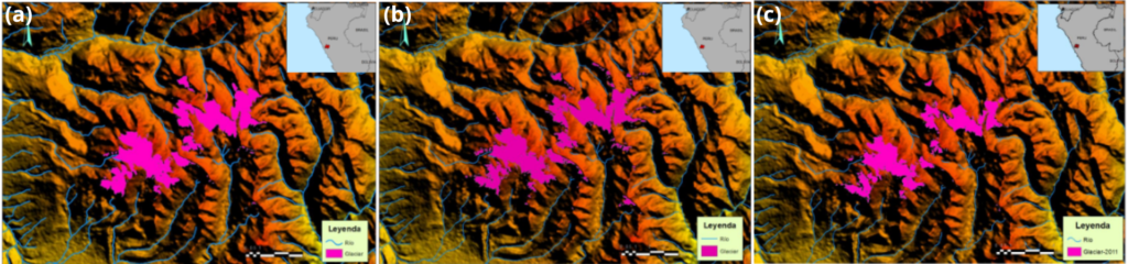 En el estudio [3] realizado en el nevado Pastoruri, se calculó el NDSI a partir de imágenes satelitales de Landsat. Además, se aplicaron procesos adicionales para descartar errores, como la confusión entre glaciares y lagunas. Por ello, el análisis se llevó a cabo para los años 1988, 1999 y 2011. En la figura siguiente se observa que el color magenta representa el glaciar en el nevado Pastoruri.