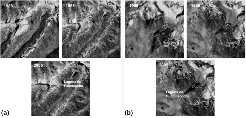 Figura 4. Secuencia del incremento de 1989 hasta el 2005 de laguna (a) Palcacocha y (b) Cuchillacocha. [4]