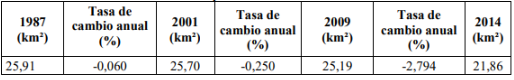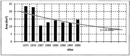 Figura 5. Tendencia temporal de la reducción del área, a partir de los sensores MSS, TM y ETM+. [5]