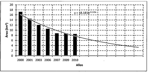 Figura 6. Tendencia temporal de la reducción del área, a partir del sensor ASTER. [5]
