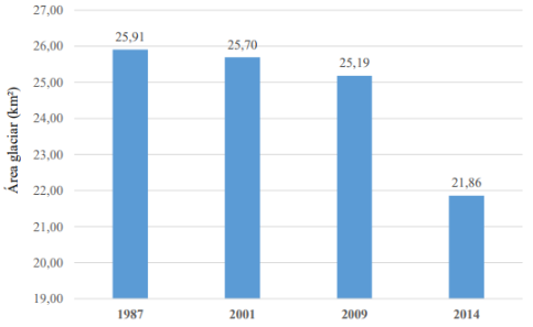 Se realizó un estudio [2] en esta microcuenca para analizar el retroceso del glaciar en 27 años. Durante ese periodo, el área glaciar se redujo un 15%, pasando de 25,91 km² en 1987 a 21,86 km² en 2014. La gráfica siguiente ilustra esta disminución progresiva.