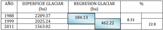 Cuadro 2. Cuadro con los valores de la regresión glaciar de los años 1988, 1999 y 2011. [3]