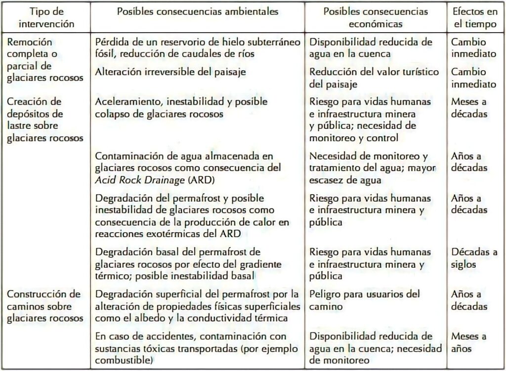 Cuadro 1. Tipología de intervenciones mineras en glaciares rocosos y sus posibles consecuencias ambientales. [3]