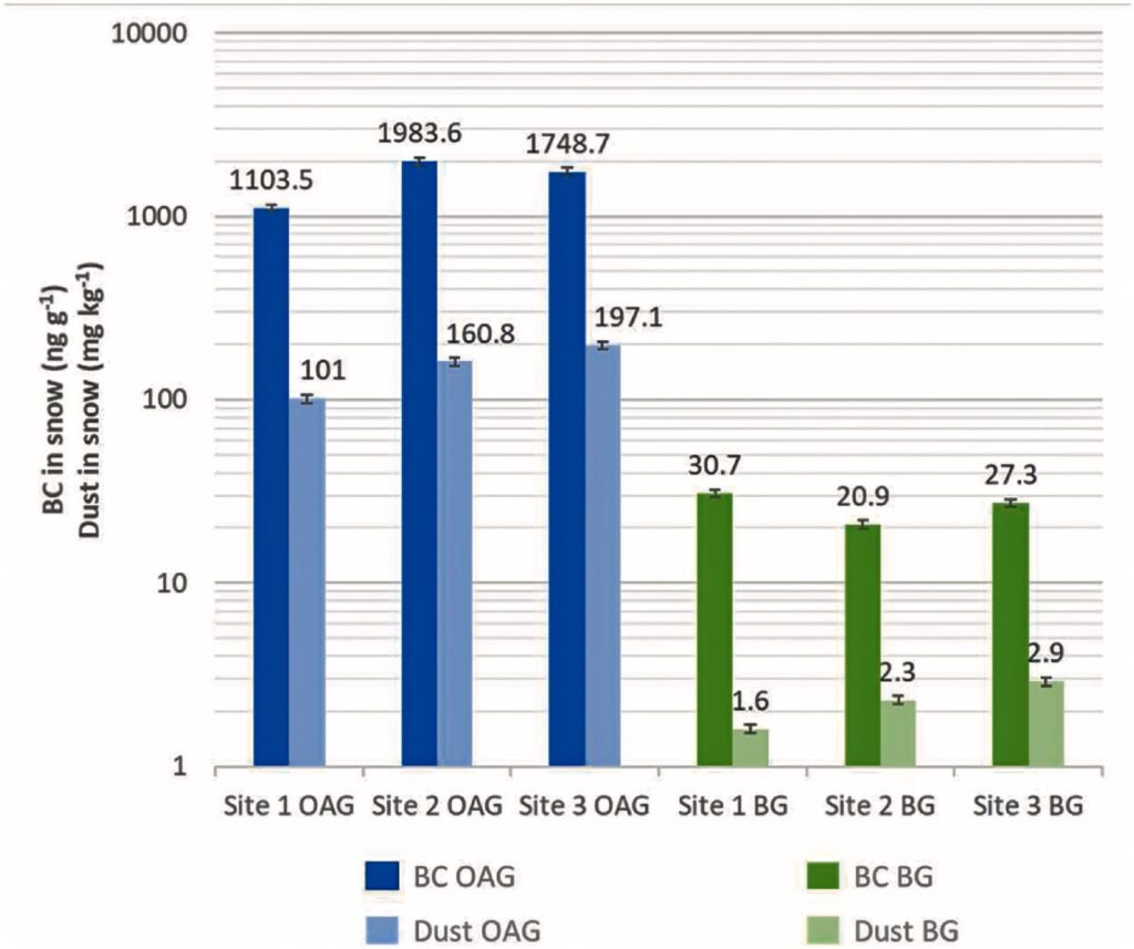 Figura 2. Concentración de BC en muestras de nieve (ng g −1 ) y Concentración de polvo en muestras de nieve (mg kg-1) obtenidas en Glaciar Alpha Olivares (barras azules) y Glaciar Bello (barras verdes) [6].