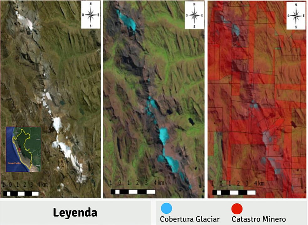 Figura 4. Nevado Huallanca (también conocido como Chaupijanca) y unión de capas con catastro minero sobre glaciares. [9]